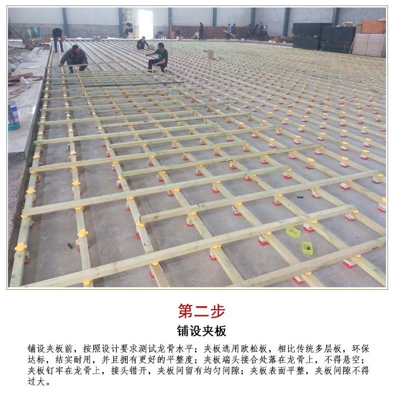1、注意檢查木龍骨的上平面是否平直順暢;注意看一下安裝、固定木龍骨的鐵釘質量(主要指長度與硬度);